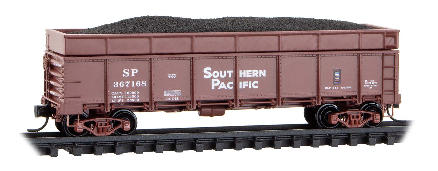 Built in 1958 by Southern Pacific as a class C-50-28 drop bottom gondola with Bettendorf trucks, this car was one of 15 that received a two foot extension of the sides in 1963, increasing their cubic capacity for less-dense cinder loading. Southern Pacific was a Class 1 railroad from 1865 until 1996, when it was absorbed by Union Pacific after falling on hard times financially in the 1970s and 1980s.