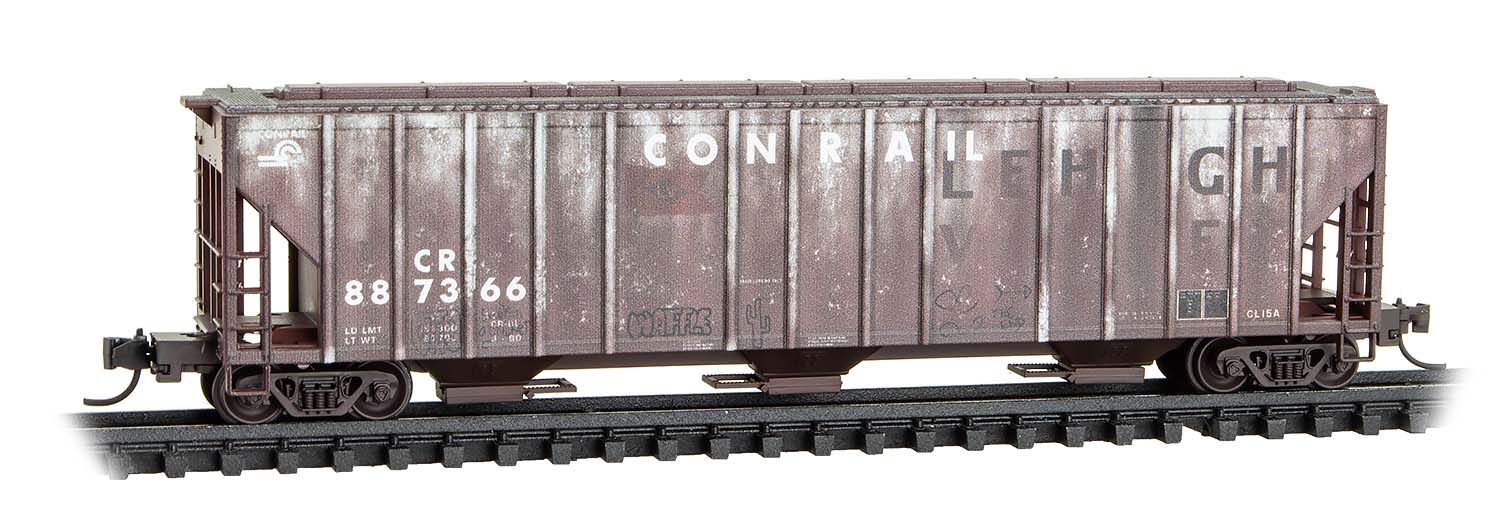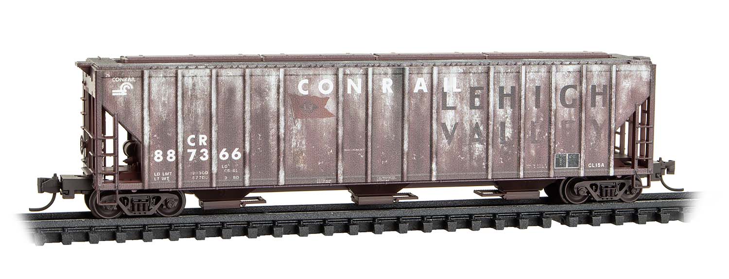 This car was built for Lehigh Valley before being repainted and absorbed into the Conrail roster. Conrail was a Class 1 railroad operating in the Northeastern United States from 1976 until 1999. Conrail was formed by the federal government through the mergers of bankrupt Penn Central, Erie Lackawanna, and other roads. Conrail eventually turned a profit, and in the late 1980s it was privatized, and continued operating until the late 1990s when it was split between Norfolk Southern and CSX.