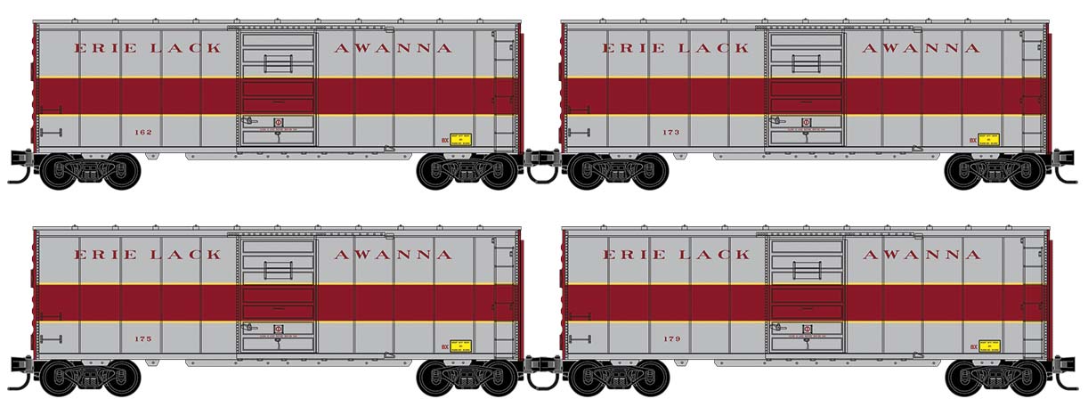 These express boxcars were used in service with Erie Lackawanna passenger trains, and belonged to Class BX. The Erie Lackawanna was formed through the 1960 merger of the Erie Railroad, and the Delaware, Lackawanna & Western Railroad.
